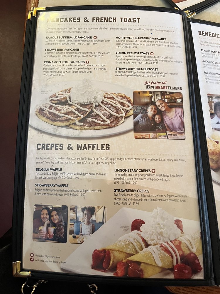 Our famous buttermilk pancakes swirled with cinnamon and sugar then topped with cream cheese icing, powdered sugar and whipped cream