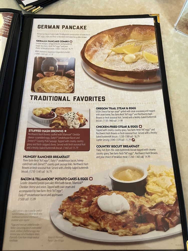 Traditional chicken-fried steak over grilled Northwest Hash Browns with peppers and onion. Topped with creamy country gravy, Tillamook Cheddar cheese-scrambled eggs and green onion.
